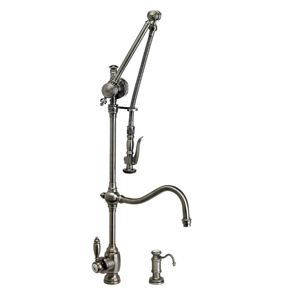 So what’s a Gantry Faucet? That’s what your friends will ask when they see this incredible centerpiece of your kitchen. How do you explain it when there is nothing else out there like it? It is unique in both design and functionality. The Waterstone Gantry’s patented design was modeled after the massive size and strength of Gantry cranes in U.S. harbors and ship yards. Gantry cranes do the heavy lifting when it comes to unloading cargo from ships. The faucet’s pre-rinse spray arm is spring loaded and has a range of motion to reach every corner of your sink. The 360 degree hook swivel spout does the job too. Single handle can be mounted with handle in front, right or left hand positions. The traditional Gantry’s distinctive look and ornate design will definitely get them talking. Handle adjusts for clearance from backsplash. Three decorative handle caps included. Resistant to reverse osmosis water.